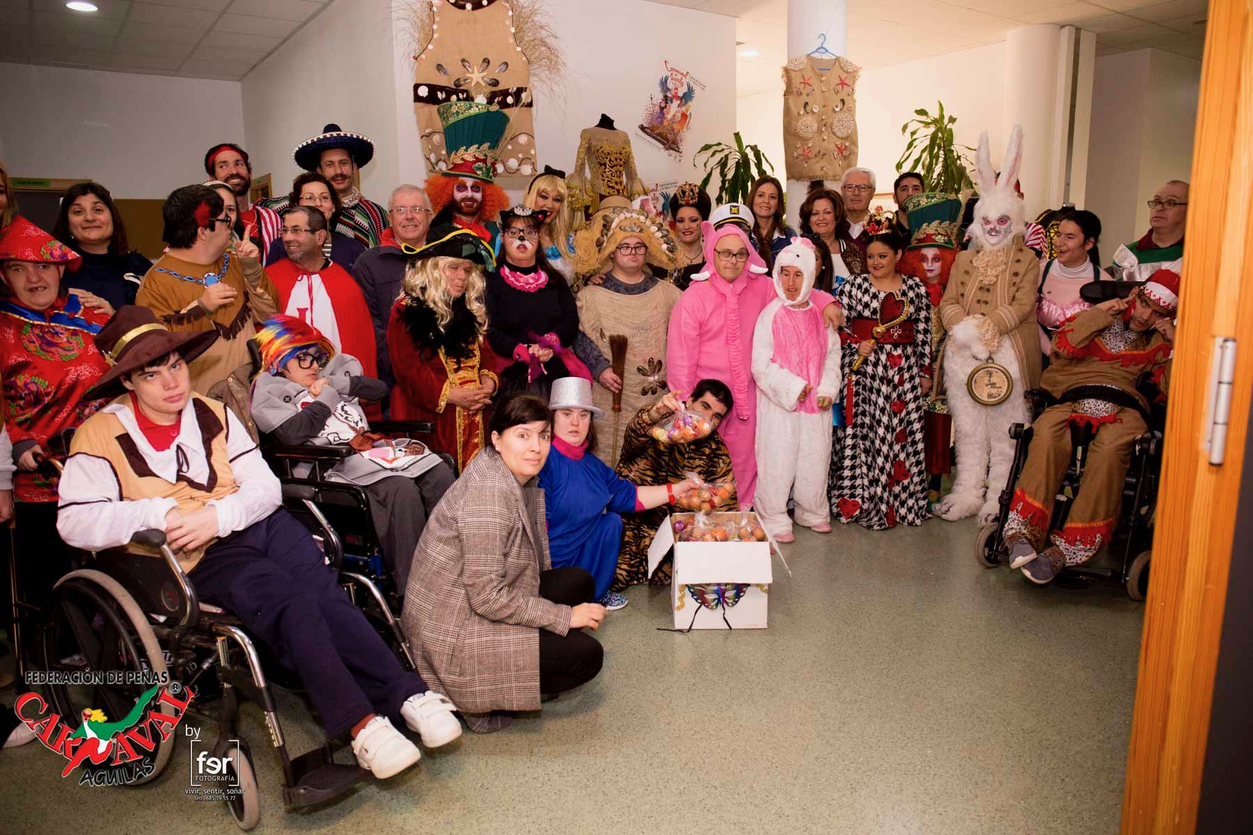 Los personajes adultos e infantiles del Carnaval han visitado esta mañana, acompañados, entre otros, por la alcaldesa de Águilas, Mari Carmen Moreno, y el edil de Carnaval, Vicente Ruiz, el Centro Ocupacional Urci donde Don Carnal y Doña Cuaresma han recibido los cascarones que usarán como armas la noche de la Batalla.