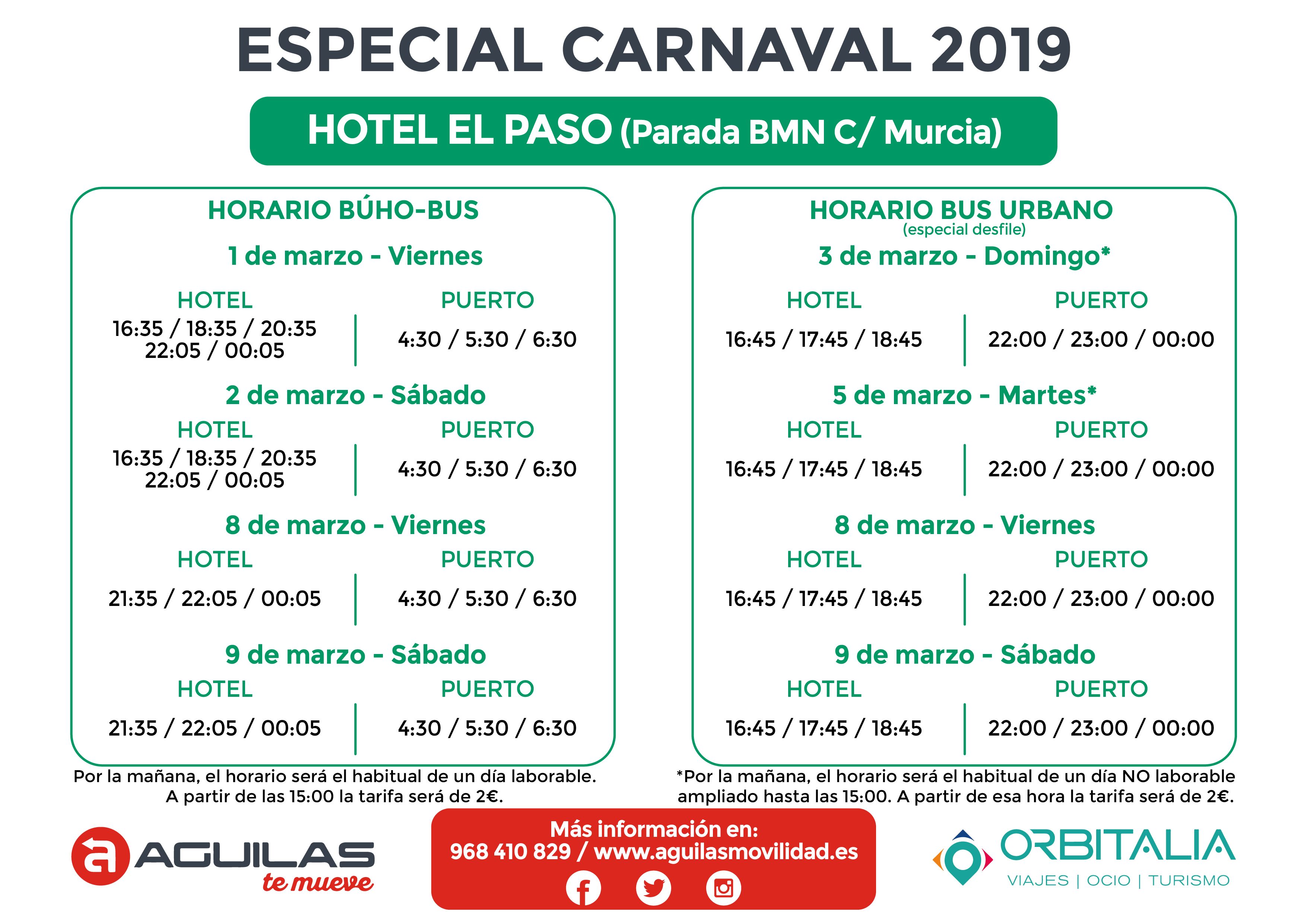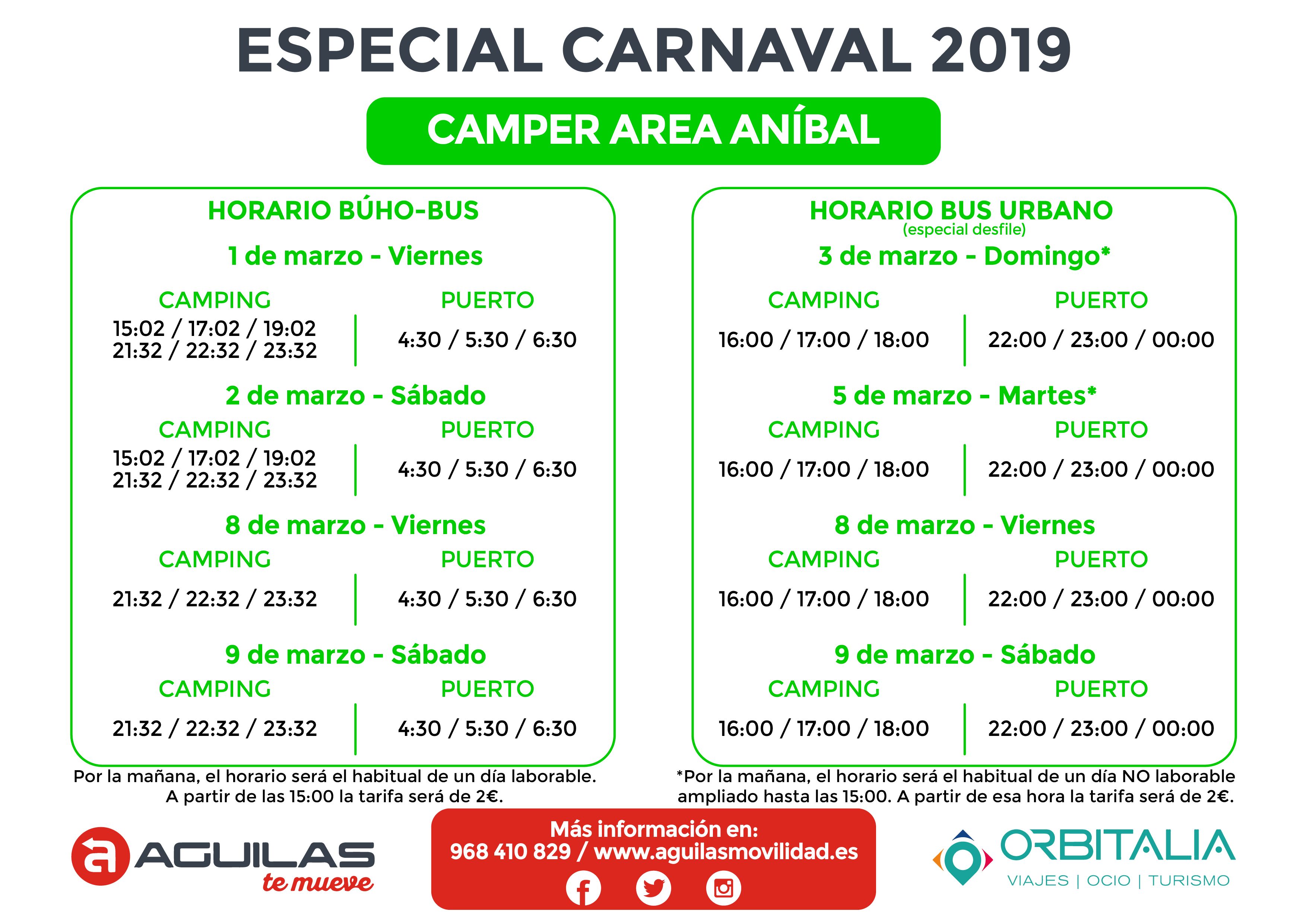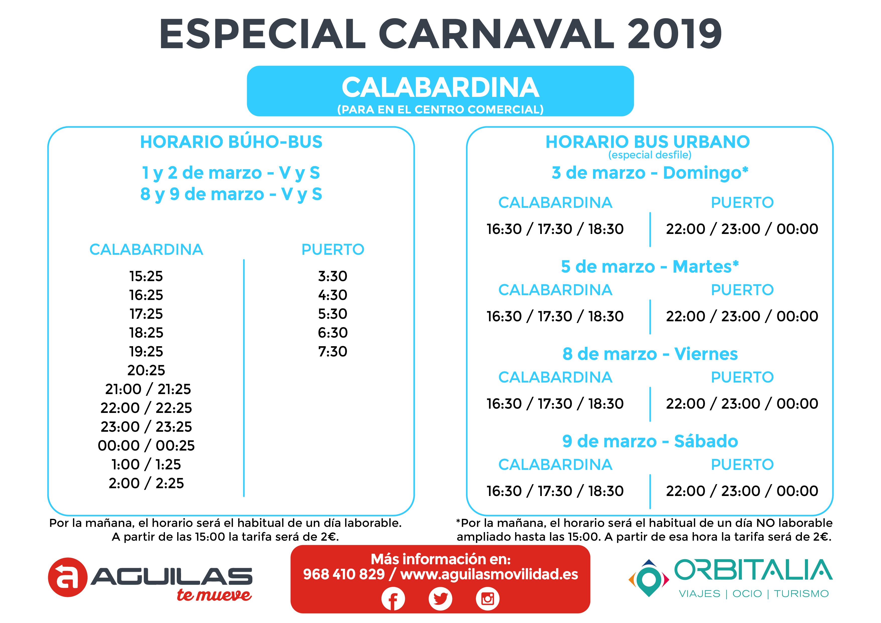 Durante los dos fines de semana de los desfiles habrá servicio prácticamente las 24 horas del día, con conexiones hasta las diferentes zonas hoteleras de la ciudad que se sumarán a las líneas y horarios habituales que seguirán dando cobertura al resto de la localidad. Entre las líneas que se verán ampliadas destaca la que hará el recorrido Camping Bellavista - Camper Área Aníbal- Albergue Calarreona - Hotel Puerto Juan Montiel - Don Miguel - Calle Murcia - Puerto Pesquero; y una segunda cuyo recorrido será: Calabardina - Apartahotel Los Collados - Centro Comercial - Puerto Pesquero.
