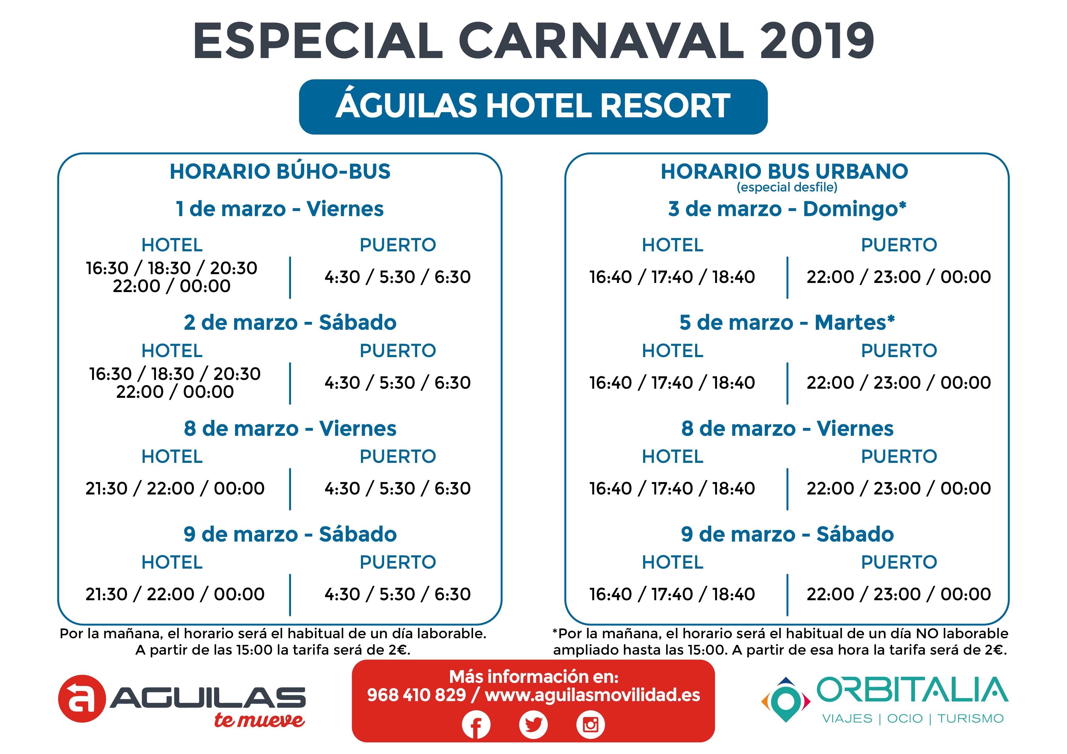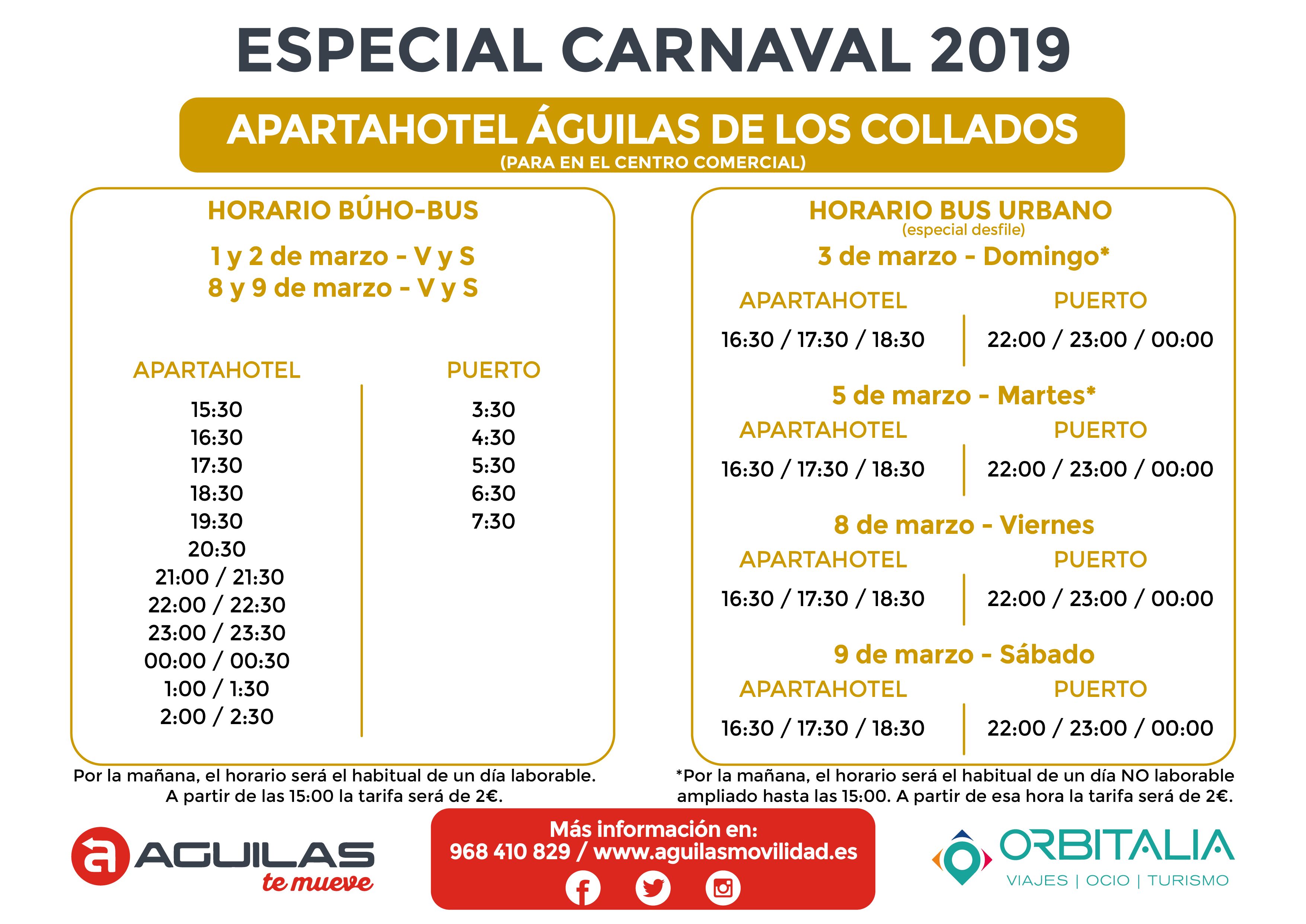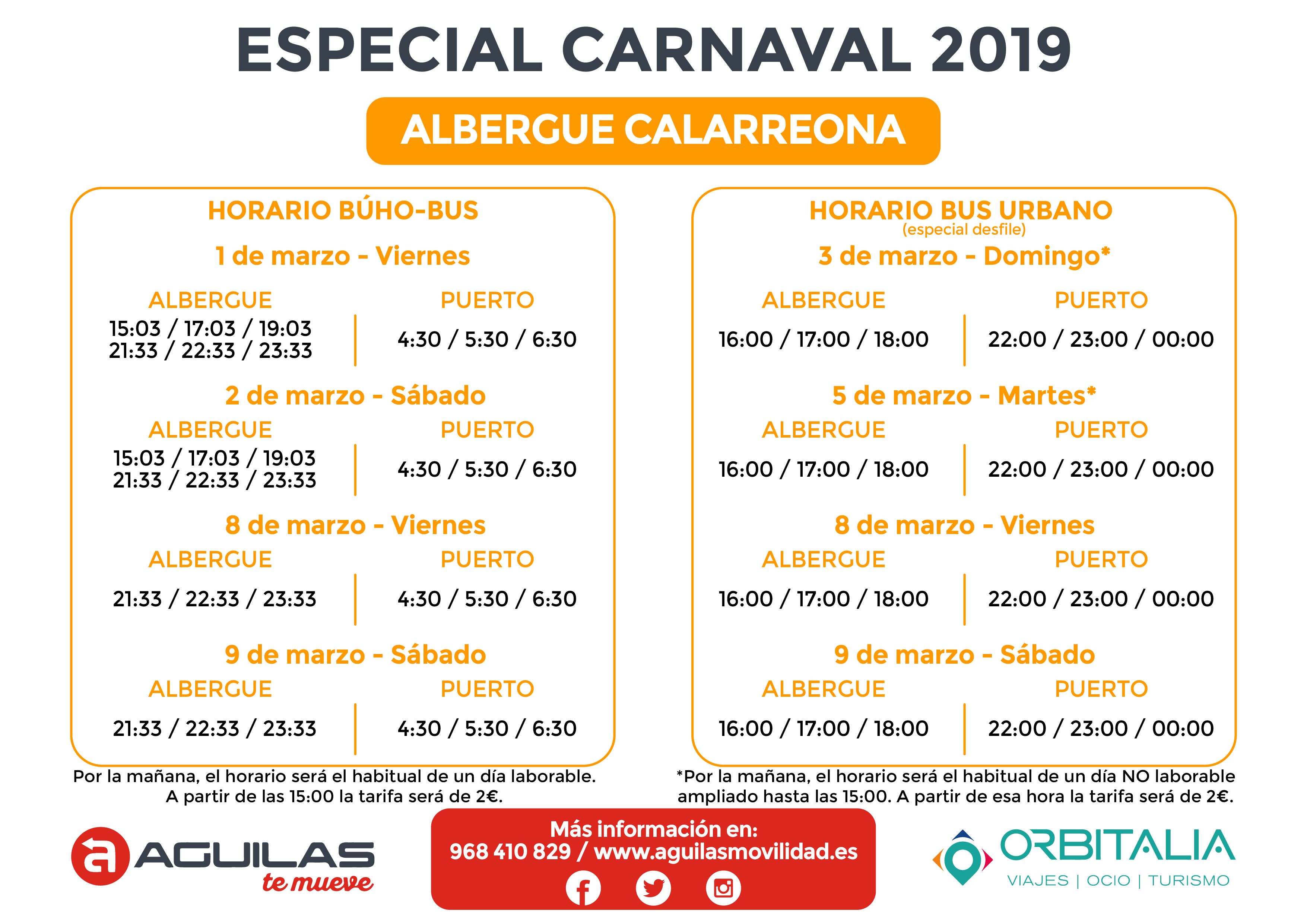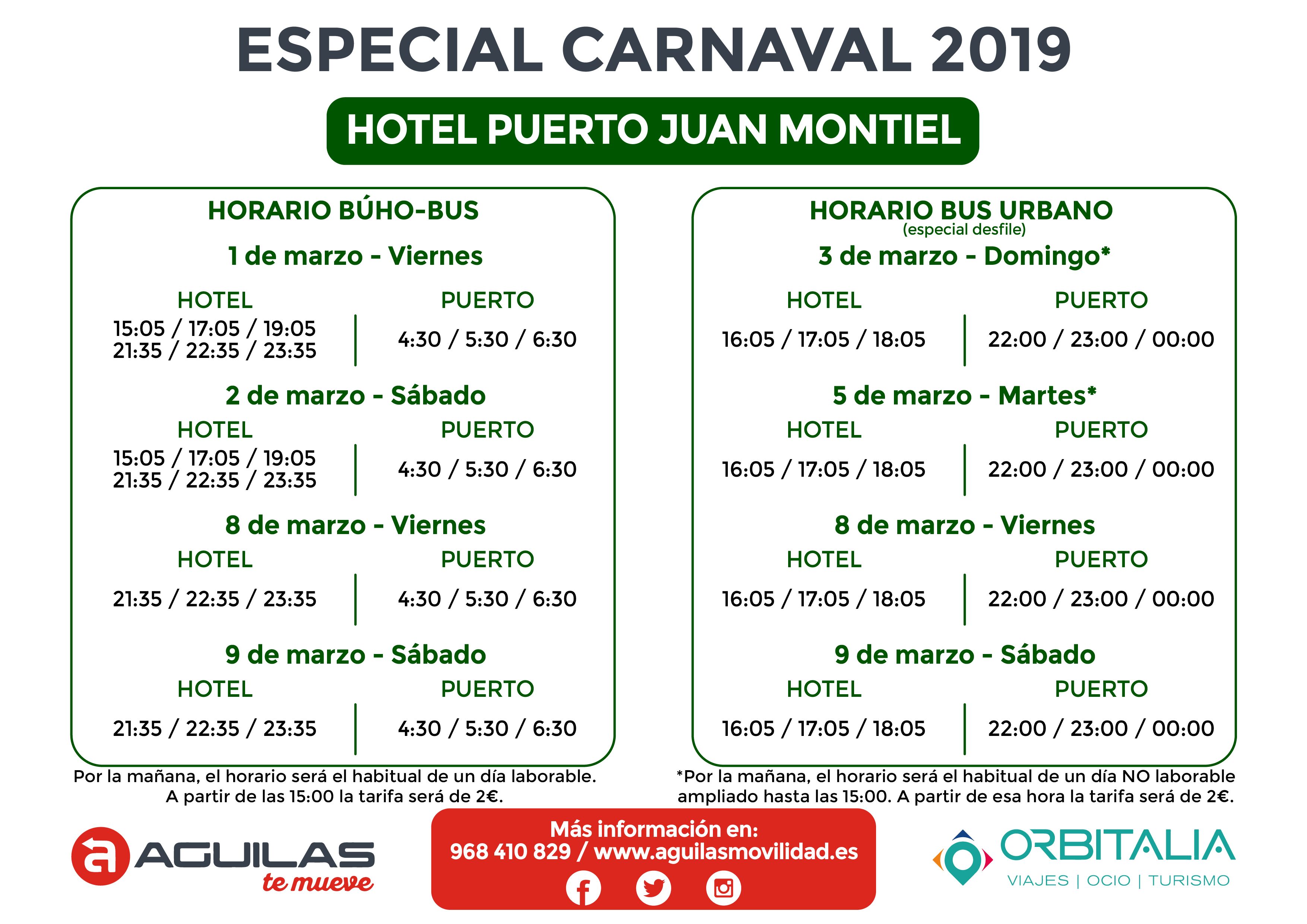 Durante los dos fines de semana de los desfiles habrá servicio prácticamente las 24 horas del día, con conexiones hasta las diferentes zonas hoteleras de la ciudad que se sumarán a las líneas y horarios habituales que seguirán dando cobertura al resto de la localidad. Entre las líneas que se verán ampliadas destaca la que hará el recorrido Camping Bellavista - Camper Área Aníbal- Albergue Calarreona - Hotel Puerto Juan Montiel - Don Miguel - Calle Murcia - Puerto Pesquero; y una segunda cuyo recorrido será: Calabardina - Apartahotel Los Collados - Centro Comercial - Puerto Pesquero.