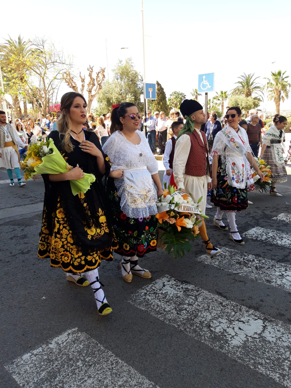 Ataviados con el tradicional traje huertano subieron al escenario situado en la puerta de la iglesa de San José a depositar su ofrenda.