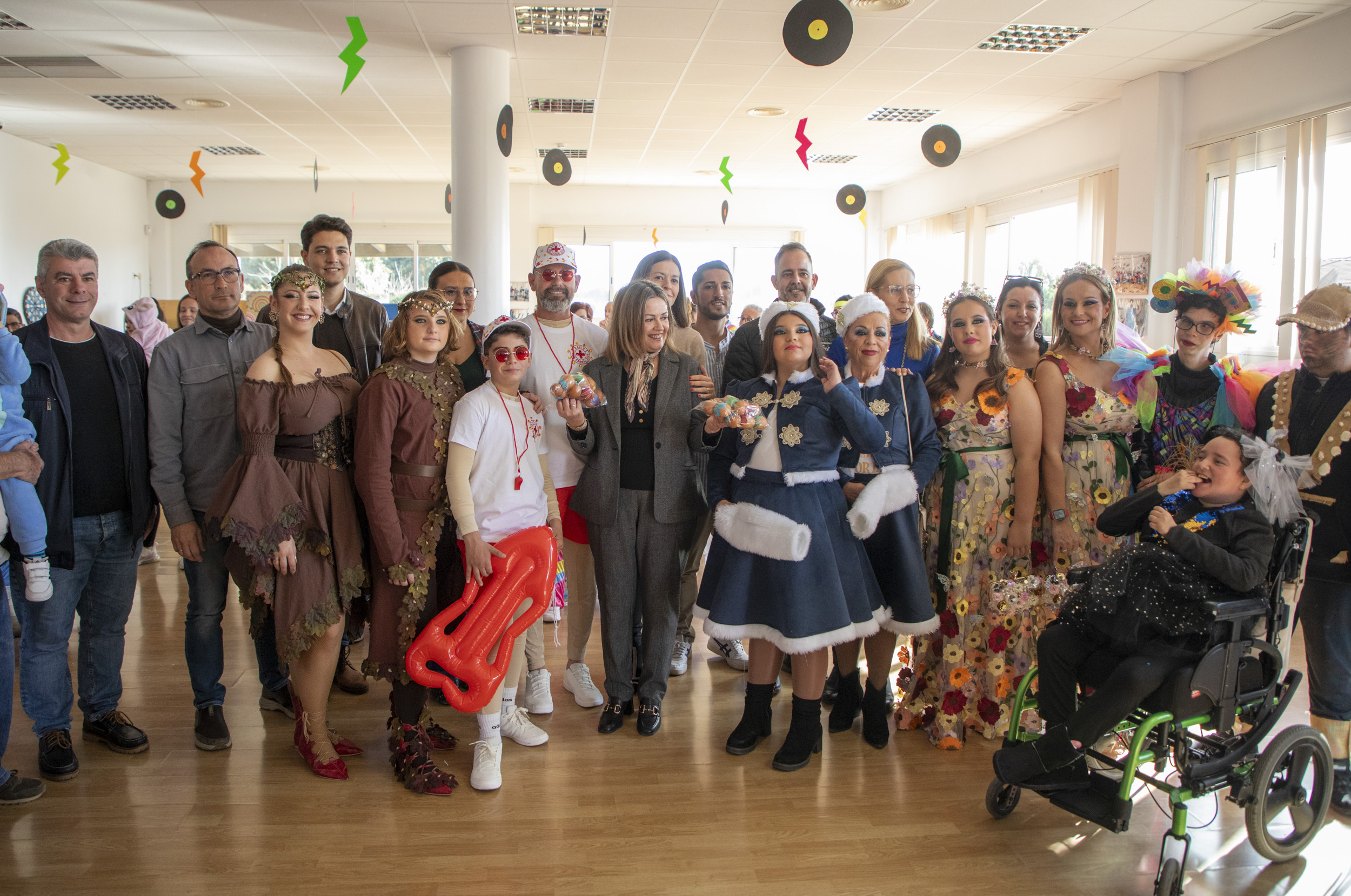 Los personajes adultos e infantiles del Carnaval visitaron ayer, acompañados, entre otros, por la alcaldesa de Águilas, Mari Carmen Moreno, el edil de Carnaval, Cristóbal Casado, y el vicepresidente de la Federación de Peñas, Ginés Parra, el Centro Ocupacional Urci donde se celebró una fiesta de Carnaval que contó con la actuación de la aguileña Carmen López encargada de interpretar, junto al rapero Eme Killer, el tema “Donde huele a Carnaval”