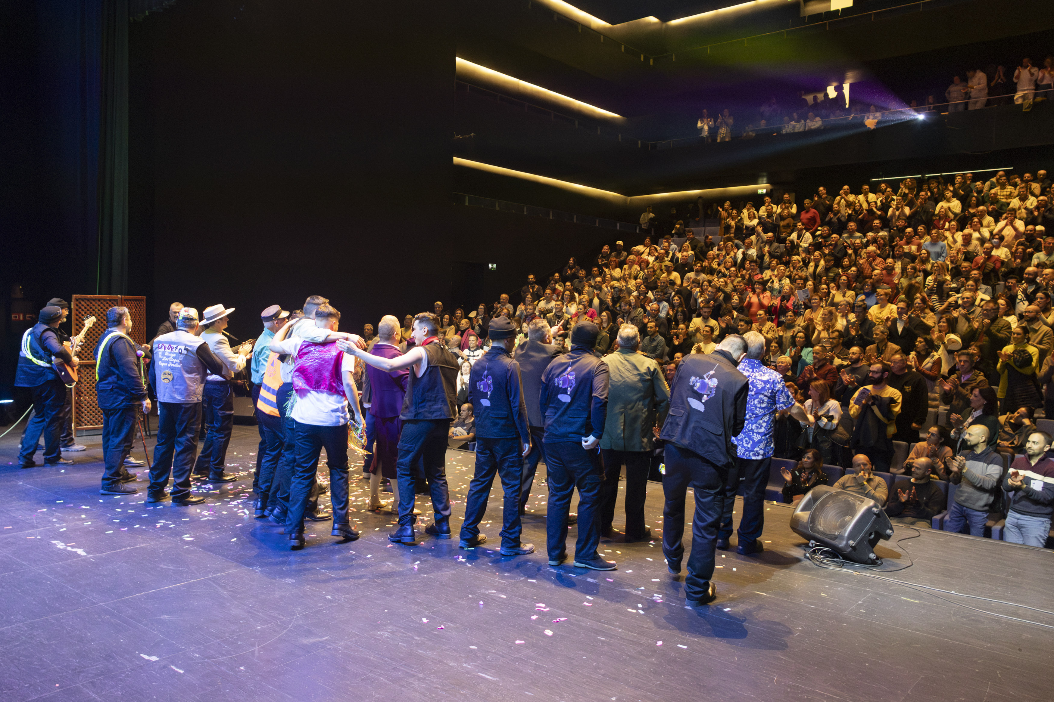 Durante dos horas, los componentes de la murga combinaron canciones y actuaciones teatrales en las que, como todos los años, no faltaron ni la crítica, ni el humor, ni los homenajes; el más sentido de ellos, precisamente, a la imagen de la Dolorosa.