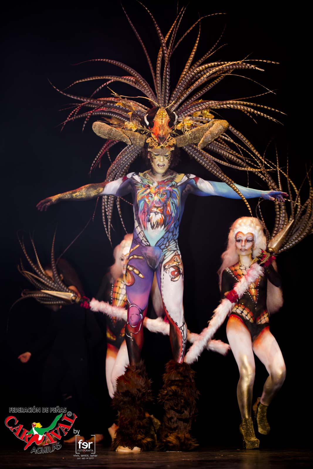 La espectacularidad del Carnaval de Águilas quedó anoche patente en le decimosexta edición del Concurso de Trajes de Papel y Maquillaje Corporal; un evento que se desarrolló en el Auditorio y Palacio de Congresos Infanta Doña Elena, espacio que registró un lleno absoluto para no perder detalle de una de las citas más esperadas del Carnaval de Águilas y que arrancó con la magnífica actuación de la batucada Dakokan Sambaleña, de la Escuela TeyDe, así como con los ritmos del Ballet Oficial de la Federación de Peñas.